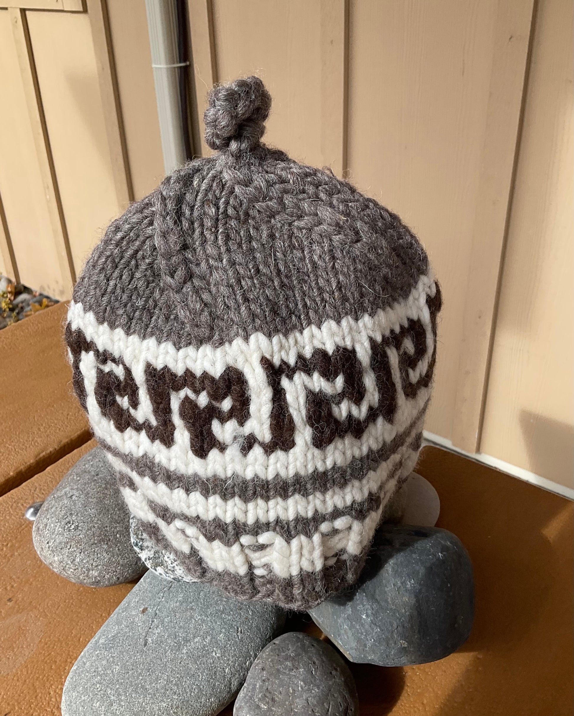 Traditional hand-knit Coast Salish patterned toque, by Lavina Olsen. Assorted adult sizes and designs.
