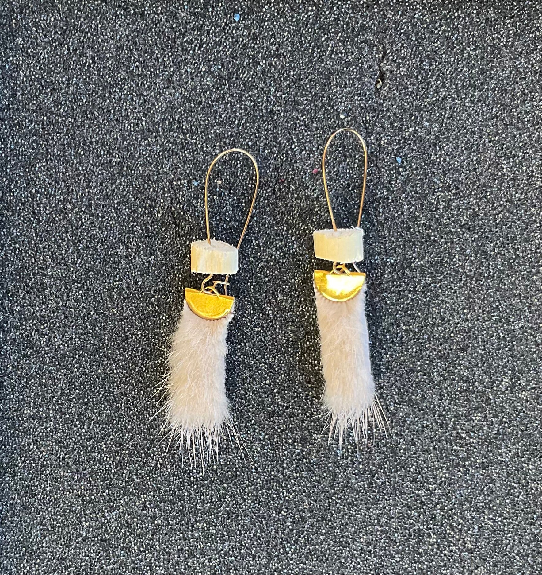 Genuine mini mink earrings, adorned with devils club beads. Handcrafted by Jessica Lavallee (Metis/Cree)